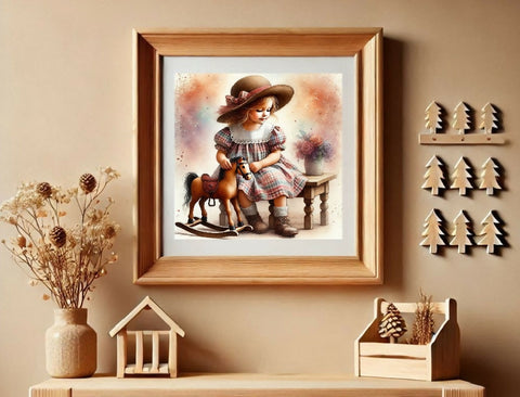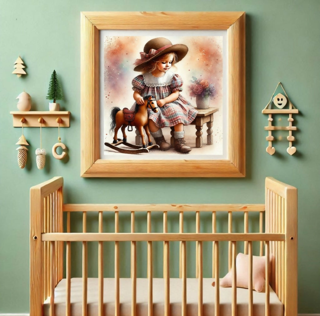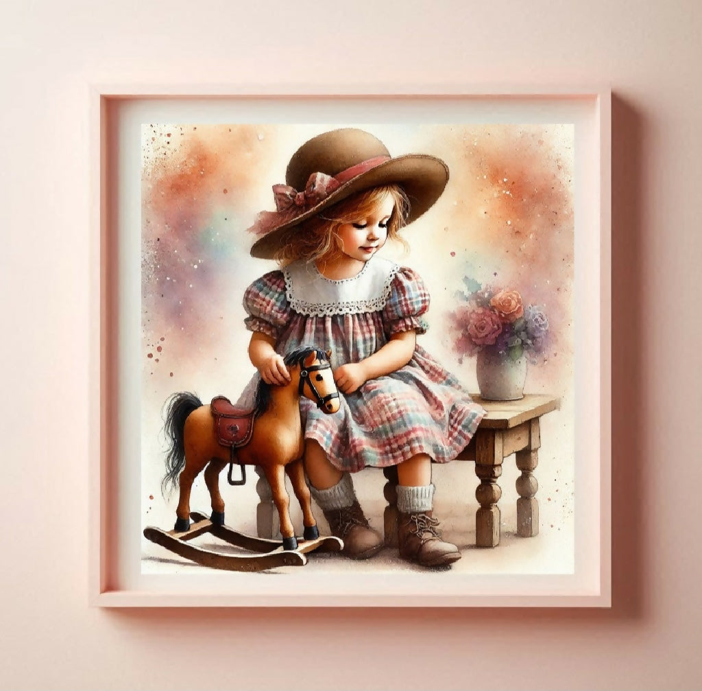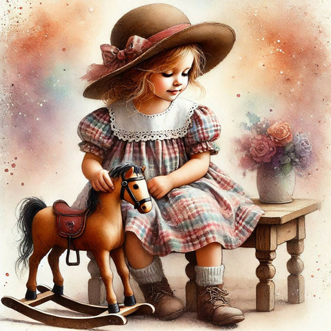 Aquarellgemälde eines verträumten Mädchens, das auf einem Tisch neben einem Schaukelpferd sitzt.