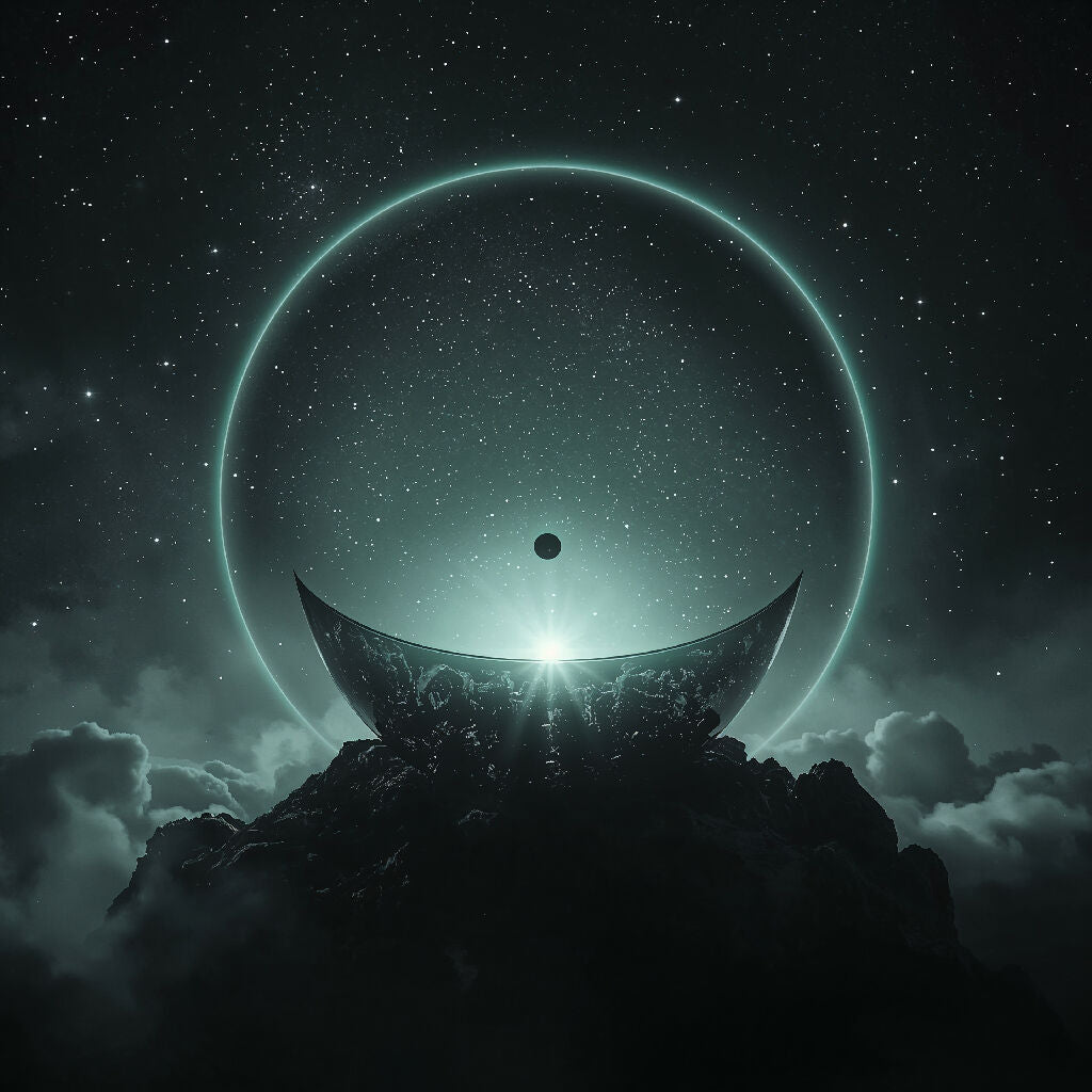 A crescent vessel balances upon a mountain peak, cradling radiance beneath an immense luminous sphere. The composition suggests offering, reception, and divine exchange, the earthbound reaching toward celestial bounty. Mist-shrouded clouds anchor the scene in terrestrial reality while the geometric perfection of the sphere asserts otherworldly presence. This threshold moment, neither full night nor complete day, embodies transformation and potential. The vessel's dark silhouette against ethereal light creates symbolic dialogue between emptiness and fulfillment, mortality and transcendence.