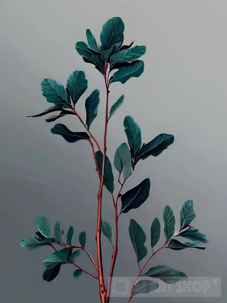 This striking piece of art features a close-up of a tree branch with vibrant green leaves and red stems. The contrast of colors against the subtle gray background creates a visually arresting image.