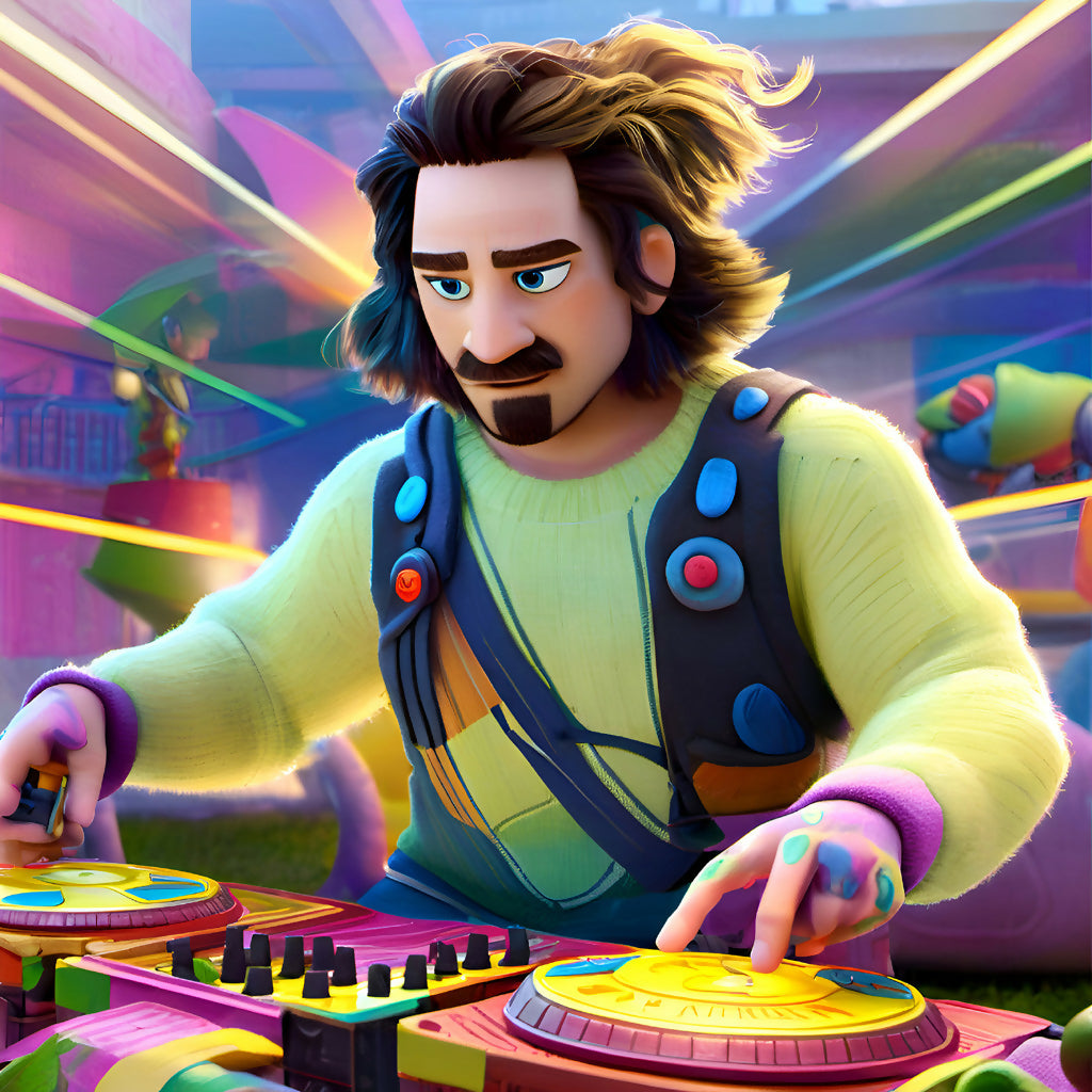 This AI-generated artwork captures the dynamic energy of a DJ immersed in a vibrant performance. The DJ is depicted with colorful turntables and a lively background, showcasing a blend of neon hues and abstract shapes. The DJ's attire includes a bright yellow sweater with a unique design and a backpack adorned with colorful buttons. The scene is filled with motion and excitement, making it a captivating piece for music and art enthusiasts alike