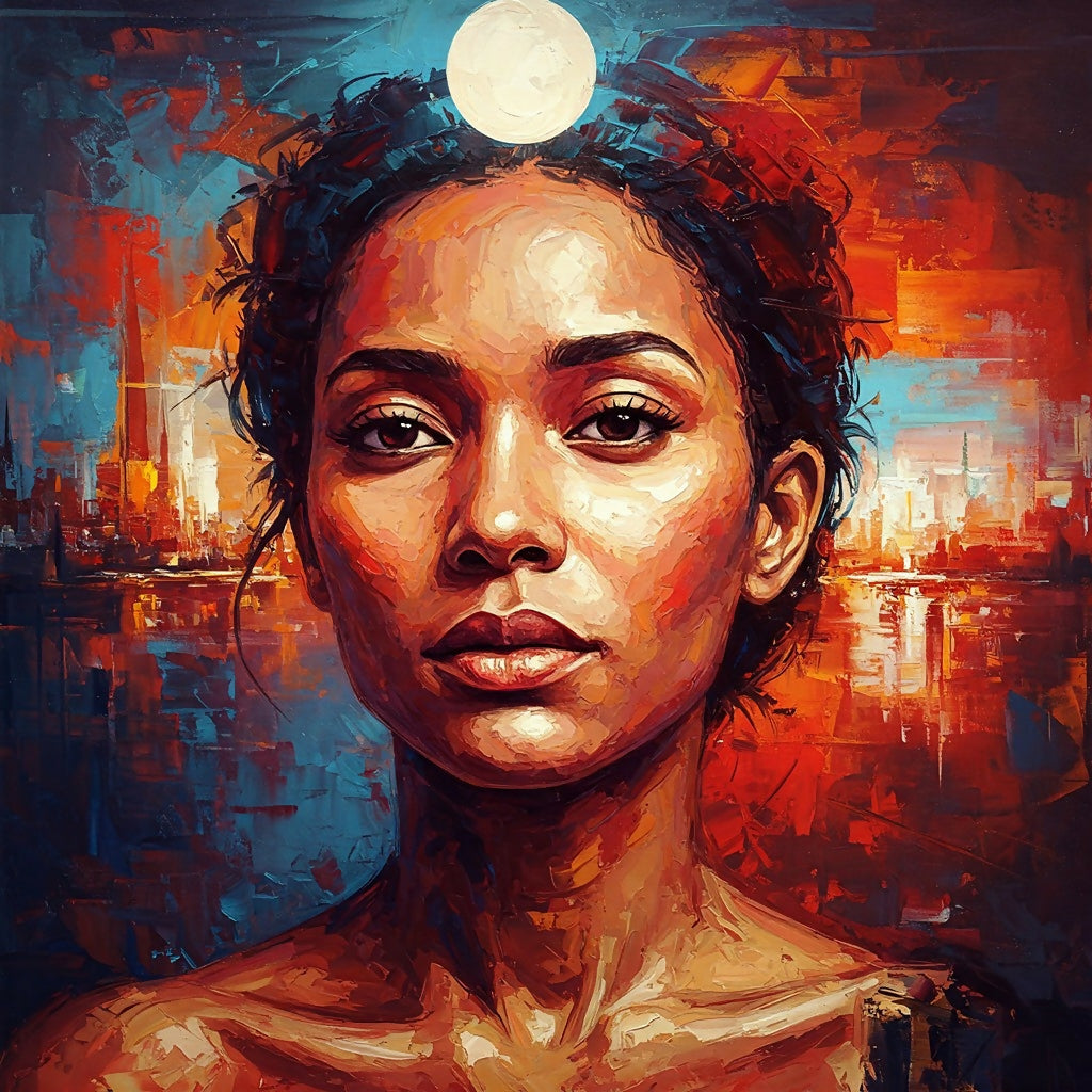 This dynamic abstract portrait captures the essence of an individual blended with the energy of an urban environment. Rendered in the style of abstract expressionism, thick impasto brushstrokes in vibrant reds, oranges, blues, and whites create a powerful and emotional representation. The subject, depicted from the face and upper torso in a slightly off-center, three-quarter view, seems to gaze contemplatively to the right. Within their features, elements suggestive of a cityscape or urban architecture are subtly integrated, creating a layered and complex composition. A large, light-colored circle, reminiscent of a sun, hovers above, adding a dramatic focal point. The non-realistic use of color and distorted perspective evoke a sense of depth and inner turmoil, hinting at the interplay between personal emotion and the surrounding urban landscape. This piece is a striking and thought-provoking exploration of identity within the modern city.