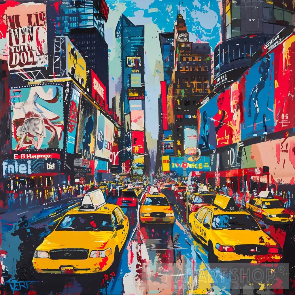A bustling city street filled with iconic signs and symbols, depicted in bold reds, blues, and yellows in Pop Art style.