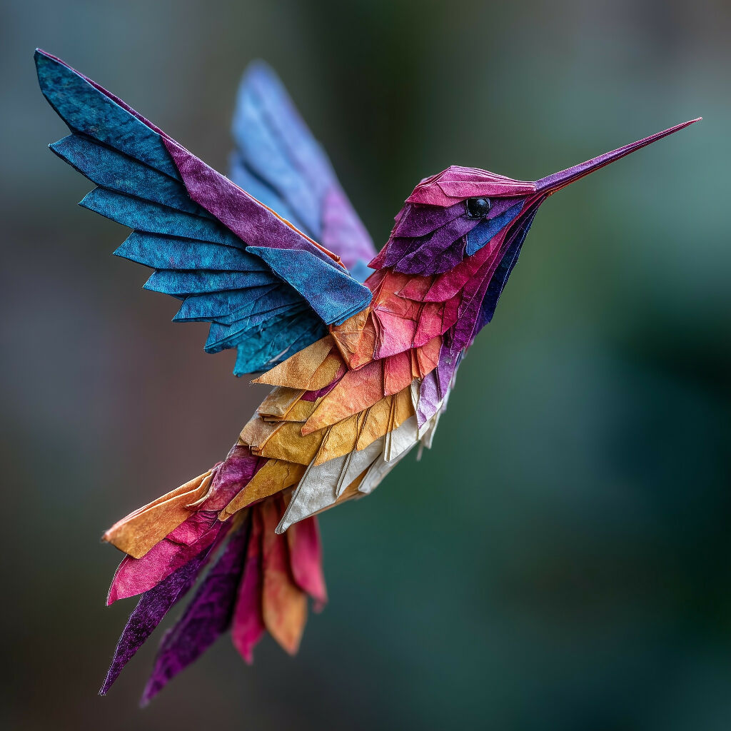 This vibrant origami hummingbird seems to hover between reality and imagination, its paper feathers catching an invisible breeze. Every fold is a brushstroke of color – deep blues, fiery reds, golden yellows – blending into a symphony of handcrafted beauty. Suspended mid-flight, it captures the essence of freedom, grace, and the delicate art of origami. This artwork brings a sense of wonder to any space, perfect for adding a pop of color and a touch of serenity. Whether you’re a nature lover, an art collector, or simply someone who cherishes beauty, this piece invites you to pause and admire the harmony between craft and creativity.