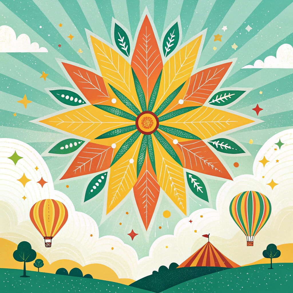 A stylized illustration depicts a large, central flower-like mandala composed of overlapping, stylized leaves and petals in shades of orange, yellow, and teal green.