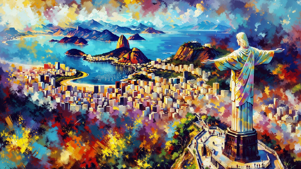 A breathtaking and colorful depiction of Rio de Janeiro, showcasing the iconic Christ the Redeemer statue overlooking the vibrant city, Sugarloaf Mountain, and the sparkling blue bay. This high-quality art print brings the energy and beauty of Rio into your space, perfect for travel lovers and art enthusiasts alike.