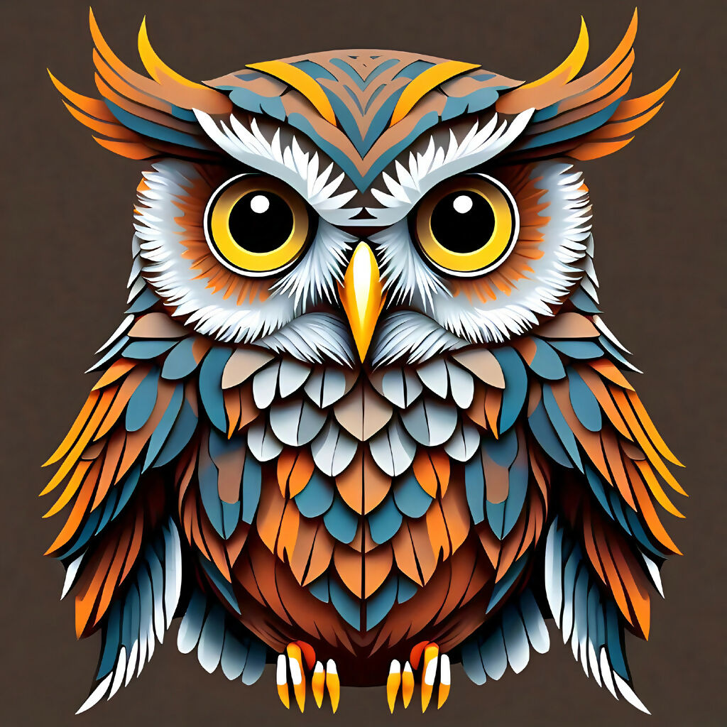 Bring bold energy and avian elegance to your space with "Vibrant Sentinel", a striking AI-generated owl portrait that fuses pop art flair with geometric precision. This digital illustration showcases a majestic owl with oversized yellow eyes, a sharp beak, and intricately layered feathers in vivid hues of orange, blue, and gray. Set against a deep brown backdrop, the owl’s stylized features pop with dramatic contrast, making it a captivating centerpiece for modern interiors, wildlife-themed collections, or educational decor.
