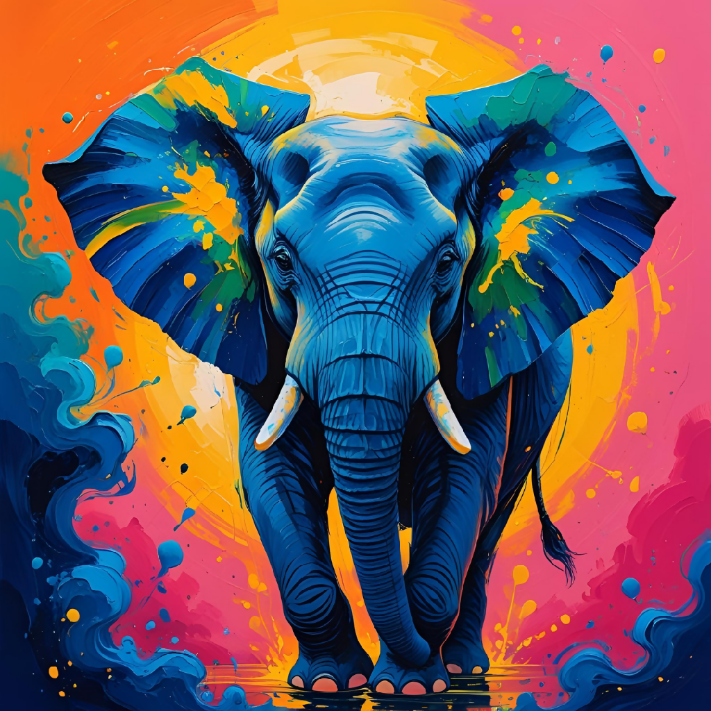 This captivating image features a majestic elephant rendered in a dynamic, abstract style. The elephant, primarily deep blue, stands prominently against a vivid background of swirling pink, orange, and yellow hues. Splashes of yellow and green accent its ears and body, adding to the energetic feel. The overall impression is one of movement and vibrant color, blending animal portraiture with expressive abstract art.