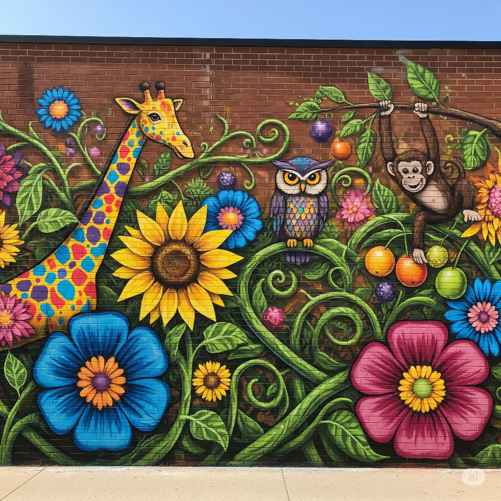 Transform your space with a touch of urban whimsy. This stunning canvas print captures a vibrant street art mural, bringing a whimsical "urban jungle" scene into your home or office. A colorful, patterned giraffe stands tall among bright, playful flowers, while a wise-looking owl perches on a winding vine. A mischievous monkey playfully hangs from a branch, creating a scene full of life and joy.