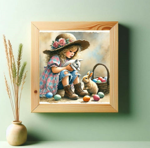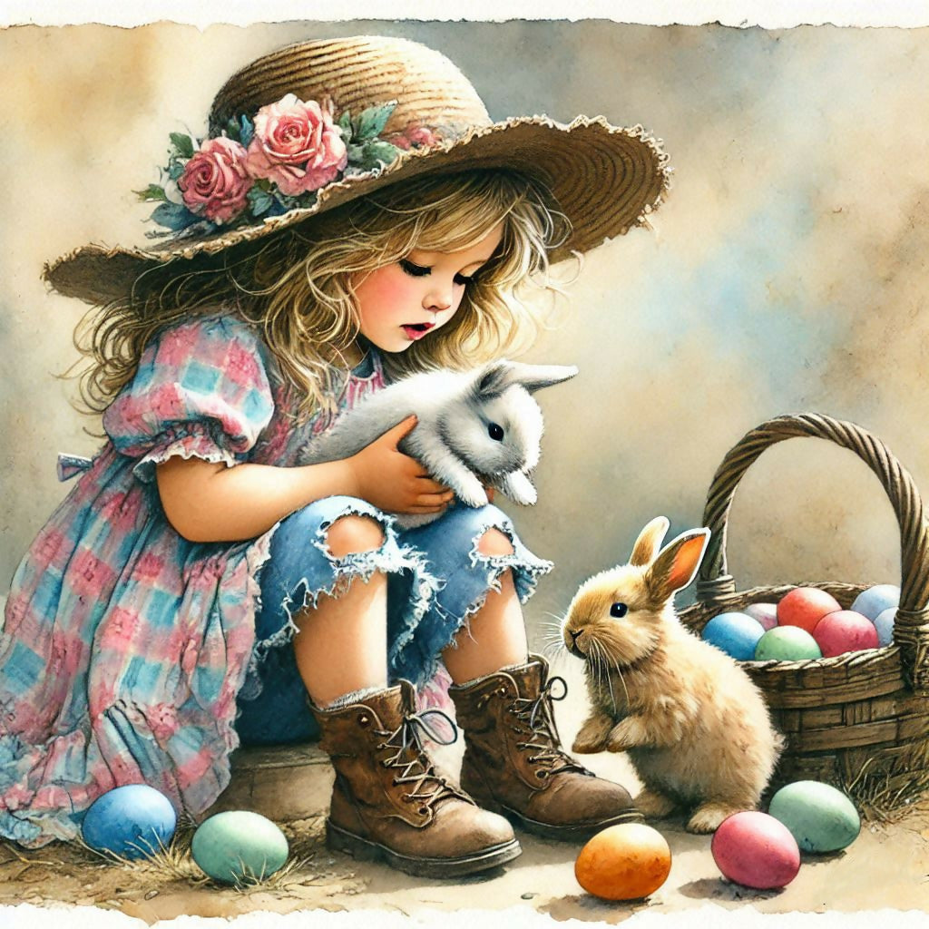 Ein nostalgisches Aquarellgemälde, das ein Mädchen mit zwei Hasen und vielen bunten Eiern darstellt.