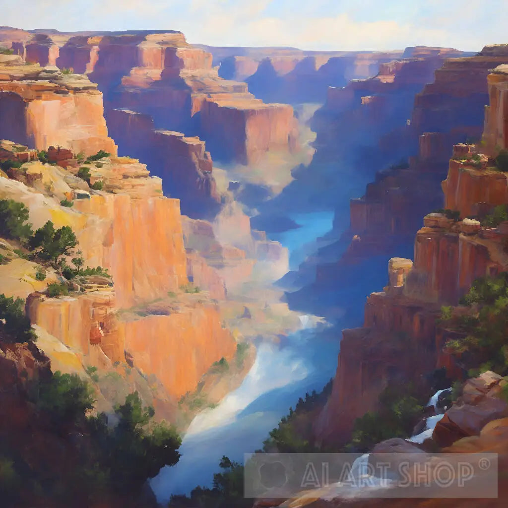 Step into an Impressionist oil painting that depicts the awe-inspiring landscape of the Grand Canyon in Arizona, USA. The perspective is from a cliffside overlook, offering a breathtaking view of the majestic canyon with its towering rock formations and winding Colorado River. The style is characterized by lively brushstrokes and a vibrant color palette that brings the natural beauty of the canyon to life. The lighting is dynamic, with the sun casting dramatic shadows and illuminating the rich colors of the rock layers. The color palette is a captivating blend of earthy tones, deep oranges, and vibrant blues.