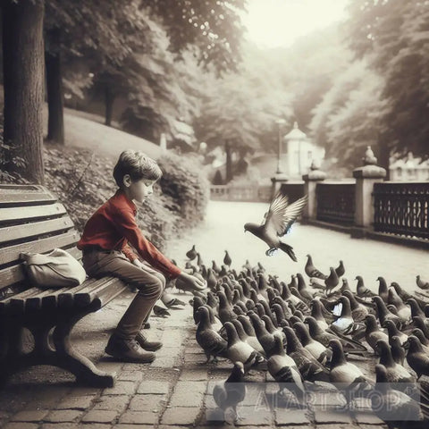 Vintage Photo of Boy Feeding Pigeons in the Park
