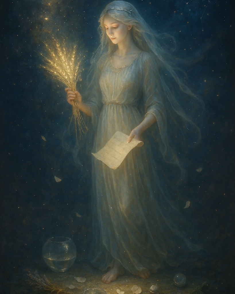 A radiant priestess stands in serene stillness, cloaked in flowing robes woven from starlight and earthlight. Her presence is precise and luminous—eyes of discernment, hands of grace. Around her, the Virgo constellation hums in the air, casting soft patterns of light across ancient scrolls, a vessel of sacred herbs, and a feather quill suspended mid-air.