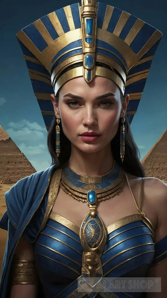 Visualize a breathtaking 2D anime-style full-body illustration of Gal Gadot as the queen of ancient Egypt. Tom Bagshaw's influence is evident in the detailed and stylized features, complemented by Adobe Illustrator's flat design. The neutral colors and dark blue palette, inspired by color theory, create a harmonious and visually striking portrayal.
