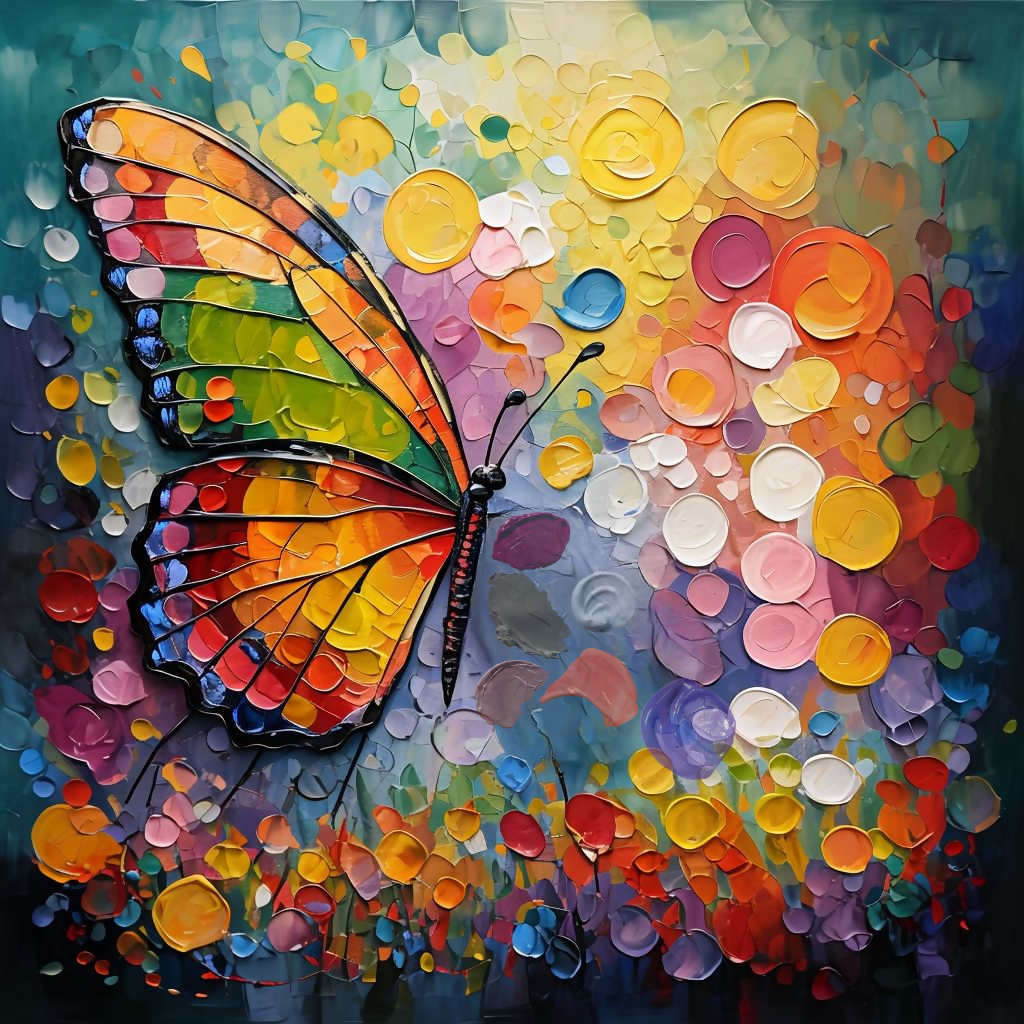 This vibrant digital artwork features a stunning butterfly depicted in an abstract impressionistic style. The colorful palette bursts with life, showcasing shades of orange, yellow, blue, green, and red, blending harmoniously into the textured background. The intricate details of the butterfly's wings contrast beautifully with the dynamic circular patterns, creating a dreamy and lively atmosphere. Perfect for lovers of nature-inspired art, this piece brings a touch of joy, vibrancy, and elegance to any space.