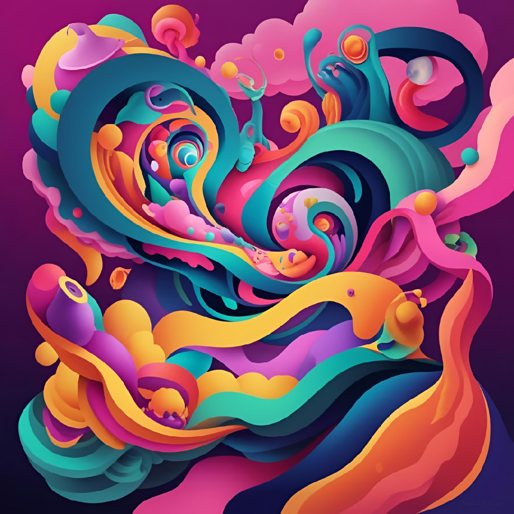 This image bursts with swirling, abstract shapes in vibrant hues of teal, orange, pink, and purple. The dynamic composition features layered ribbons and cloud-like forms that spiral and intertwine, creating a sense of movement and depth. The playful arrangement evokes a dreamlike, fantastical landscape, blending elements of surrealism and modern digital art. The rich color palette and fluid forms invite the viewer into a whimsical world of creativity and boundless imagination.