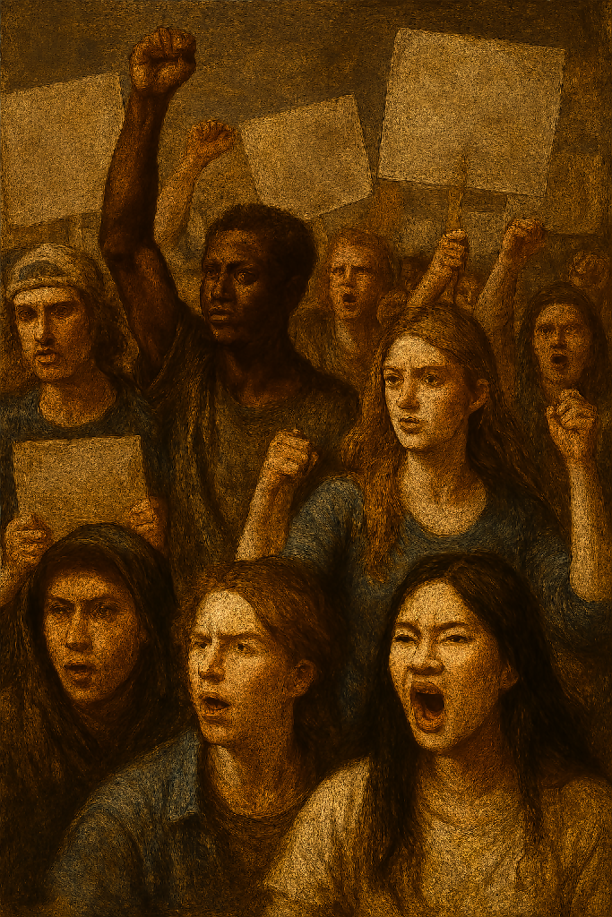 The Painting channels Da Vinci’s mastery of form and emotion to depict a diverse group of Gen Z protesters. Rendered in warm, earthy tones and textured brushwork, the scene captures young people of all races—African, Asian, Caucasian, and more—united in defiance. Raised fists and expressive faces fill the canvas, each figure painted with the solemn dignity of a classical portrait.