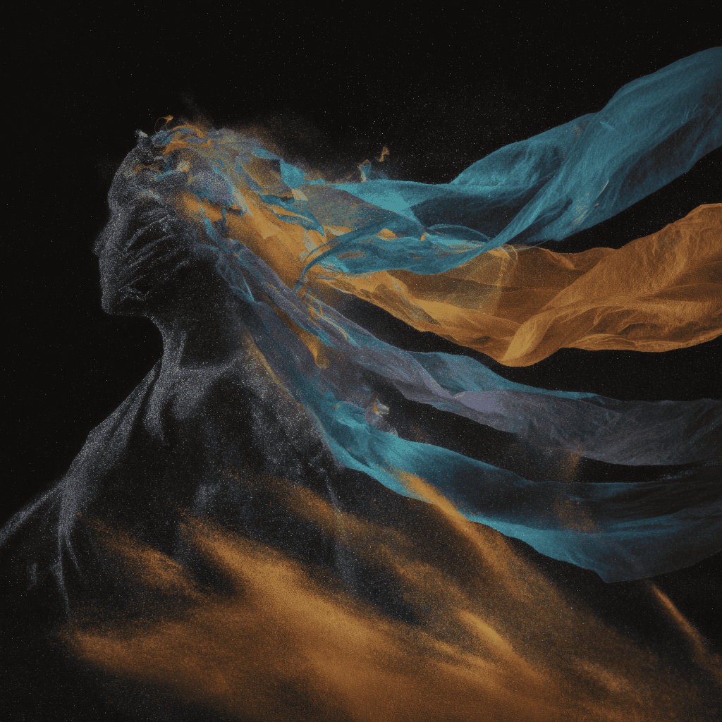 Tags: ai generated art, surrealism ai art, dissolving figure, cosmic veils, energy explosion, silhouette transformation, rainbow silk, emotional release, luminous dissolution, fantasy silhouette, lumenforge