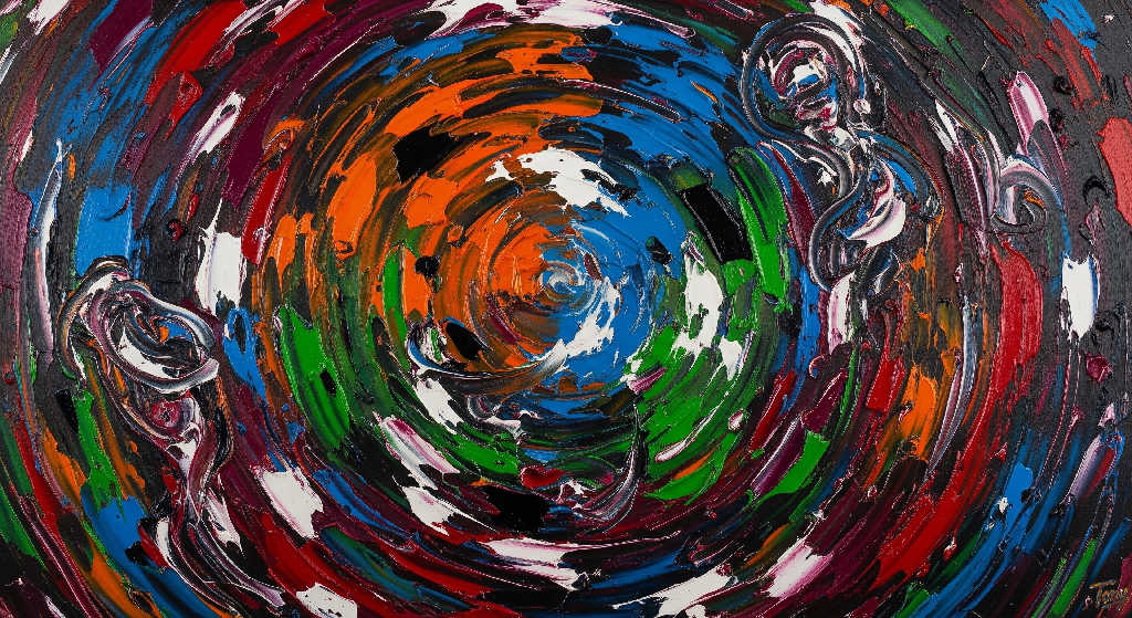 The vibrant palette of reds, oranges, blues, greens, and whites is applied with a vigorous hand, creating a chaotic yet cohesive energy.