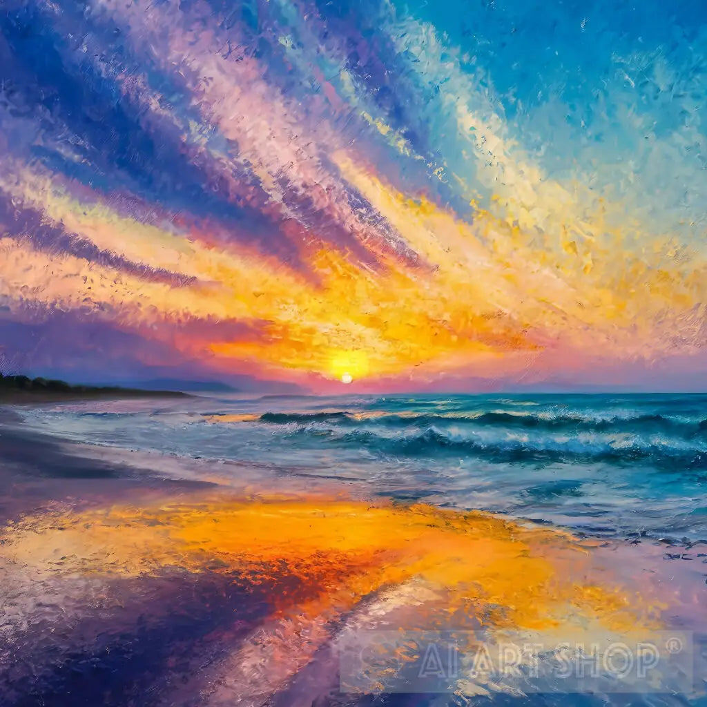 A beautiful painting captures the serene scene of a sunset over the ocean. It skillfully depicts the vibrant colors of the sky as the sun dips below the horizon, casting a warm glow over the tranquil waters. showcasing the intricate details of the waves lapping against the sandy beach. Shades of blue and orange blend seamlessly in the sky, creating a mesmerizing rainbow effect. The painting evokes a sense of peace and tranquility, inviting the viewer to immerse themselves in the beauty of nature''s masterpiece.
