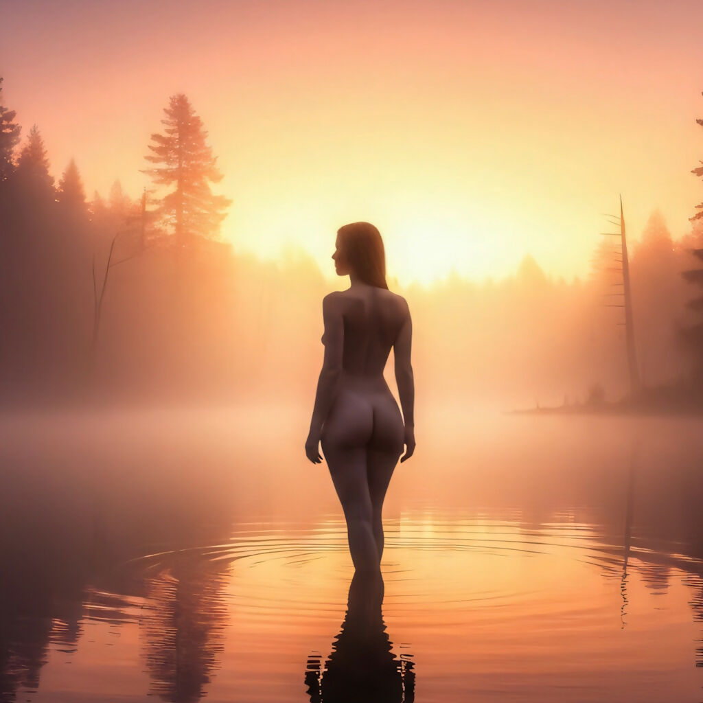 Serene color portrait of a woman walking into the misty water of a lake, bathed in the warm, diffused light of the setting sun.