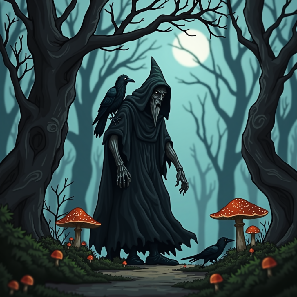 The Worlock carries his Raven through the forest hiding amongst the trees and fog. Waiting for his next victim.