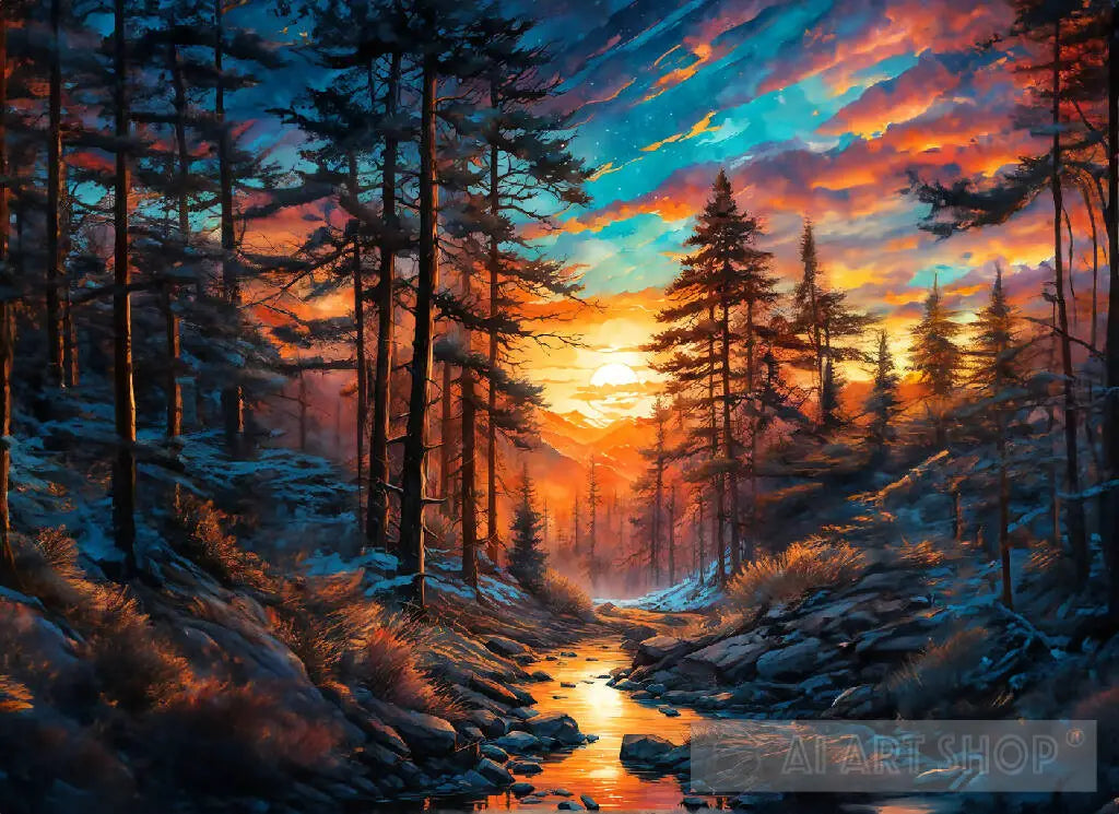 Tall trees on the banks of the river with nature in warm colors as the sun sets within the clouds mixed with the picturesque colors of nature with a blue and orange sky tending to shades of brown.
