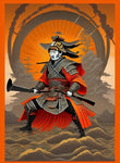 This dynamic wall art depicts a fierce samurai standing tall as the dawn breaks, casting a radiant glow over the battlefield. Clad in vibrant red armor, the warrior holds an imposing weapon, ready for battle. The striking contrast between the warm tones of the rising sun and the samurai’s intense expression makes this piece a bold statement of strength and determination
