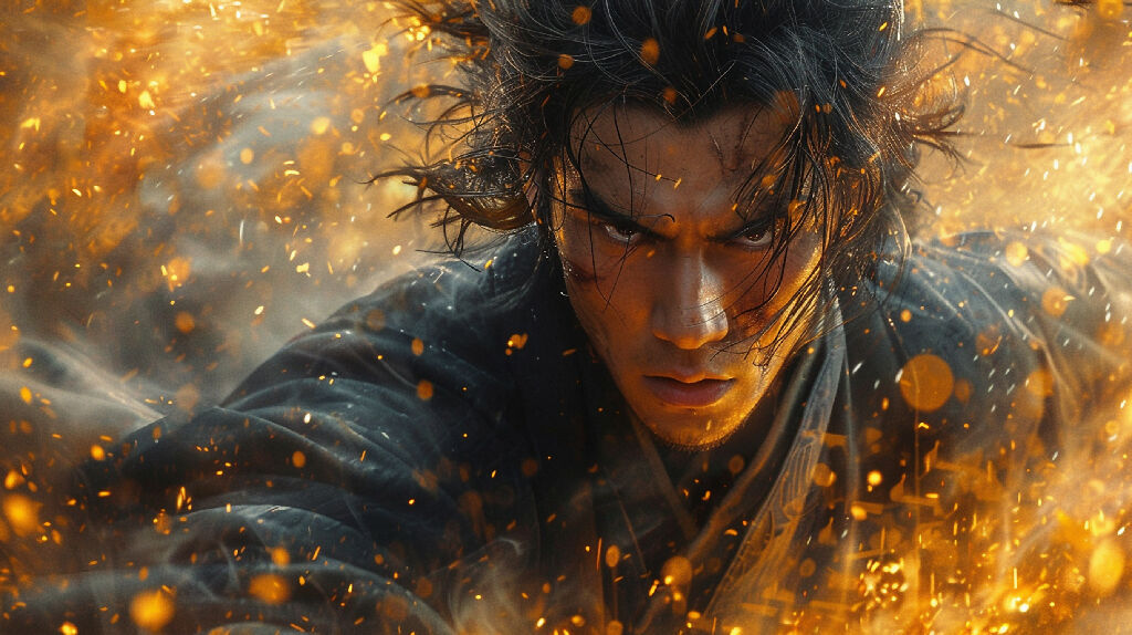 A fierce close-up of a samurai warrior captures the intensity of battle. His eyes blaze with wrath, brows furrowed and jaw clenched in unwavering focus. The ornate details of his battle-worn helmet glint under scattered flecks of gold that shimmer around him like sparks in a storm. Sweat beads along his temple, mixing with dust and honor. The gold glitters swirl in the air, casting an almost mythical aura, highlighting the deadly grace and unyielding spirit of a warrior on the edge of vengeance.