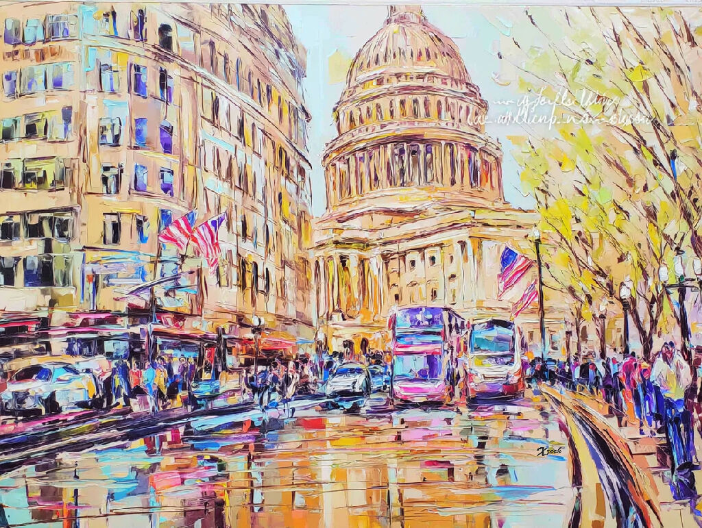 This is a vibrant, impasto painting of a bustling street scene in Washington D.C., featuring the U.S. Capitol Building as a prominent backdrop. The artwork is characterized by its thick, textured brushstrokes and a warm, dynamic color palette.