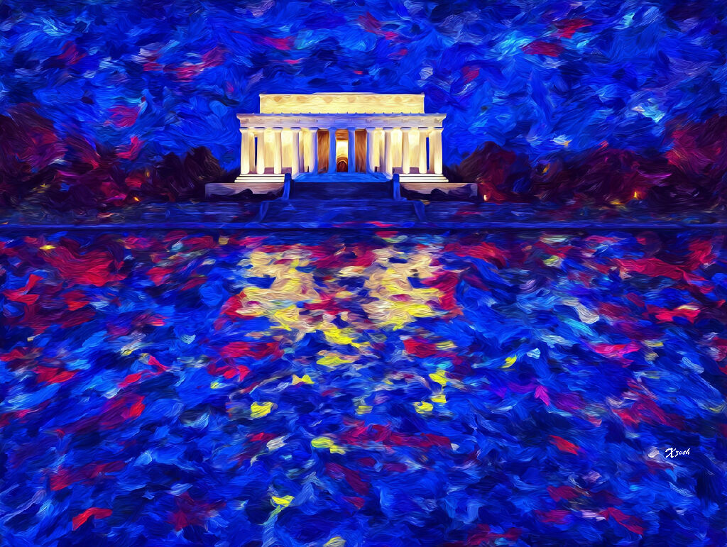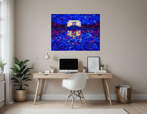 In the foreground, the smooth water of the reflecting pool captures the memorial’s light, casting shimmering reflections across the surface. These reflections are painted with energetic strokes of yellow, gold, and white, intermingling with the bold blues, reds, and purples of the water. The overall effect is both mesmerizing and dreamlike, inviting the viewer to linger on the dazzling interplay of light and color.