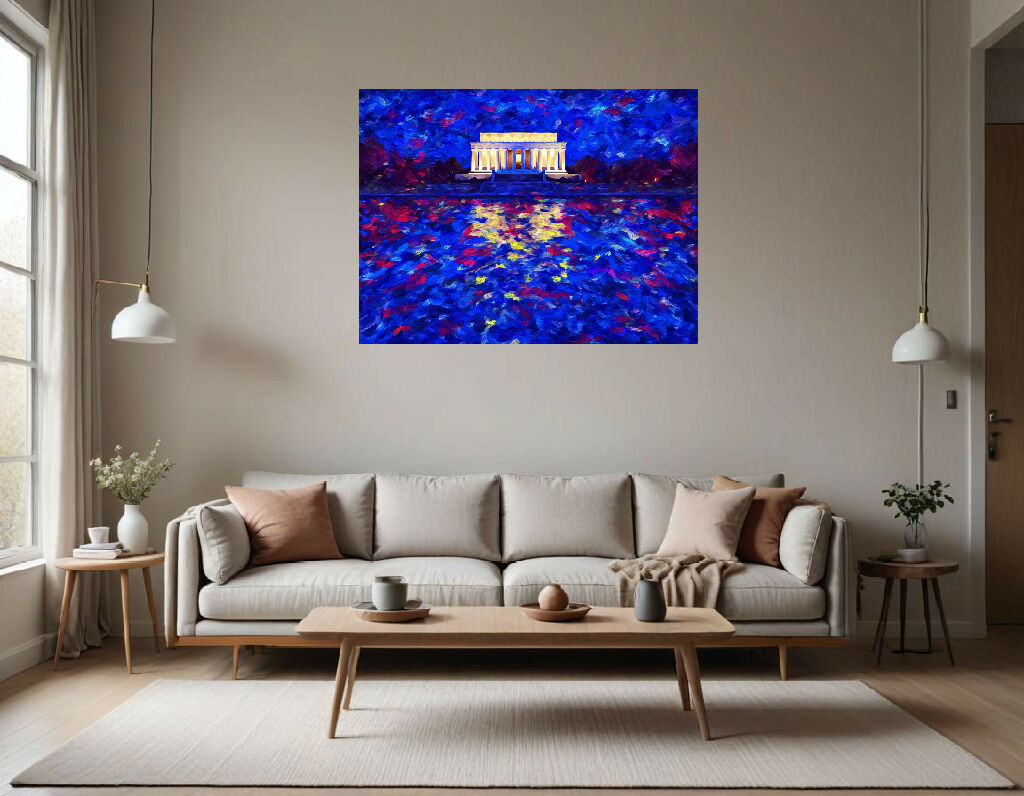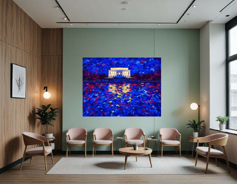 This painting depicts the iconic Lincoln Memorial at night, rendered in a vibrant, expressive style reminiscent of impressionism.