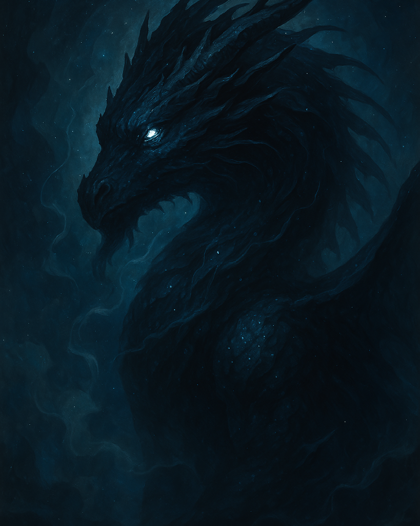 This AI-assisted digital painting features a mythic astral dragon—vast, ancient, and luminous—watching over the unseen worlds from a realm between stars and memory. Glowing scales ripple with ethereal light, and the mist around him seems to hum with soul-coded silence.