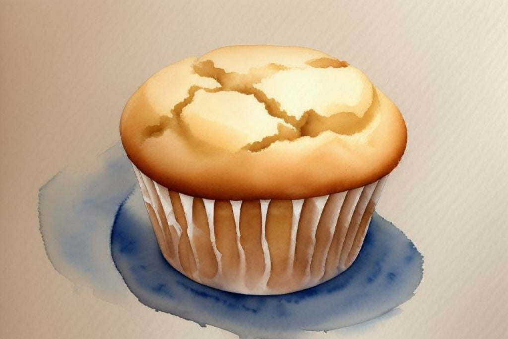 A watercolor drawing of a delicious-looking muffin. Light brown background.