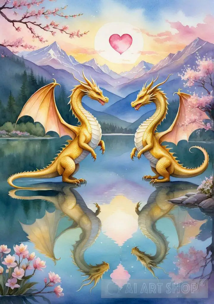 Immerse yourself in the enchanting world of watercolor illustrations with a stunning piece featuring two majestic dragons soaring over a tranquil lake