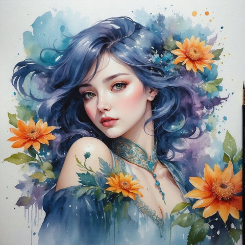 The image features a watercolor painting of a person with blue hair adorned with orange flowers. The person’s face is obscured by pixelation. The artwork showcases vibrant colors and a blend of floral elements, creating an interesting contrast between the natural and the human subject.