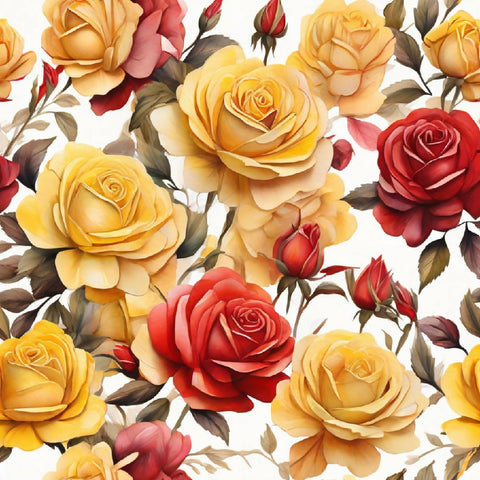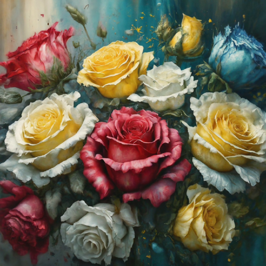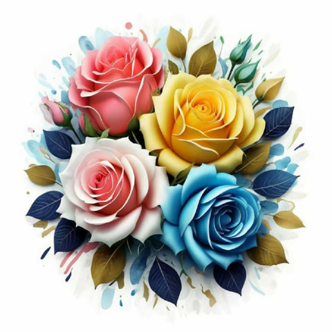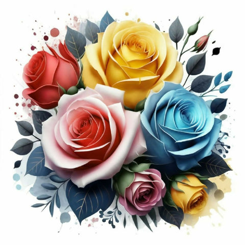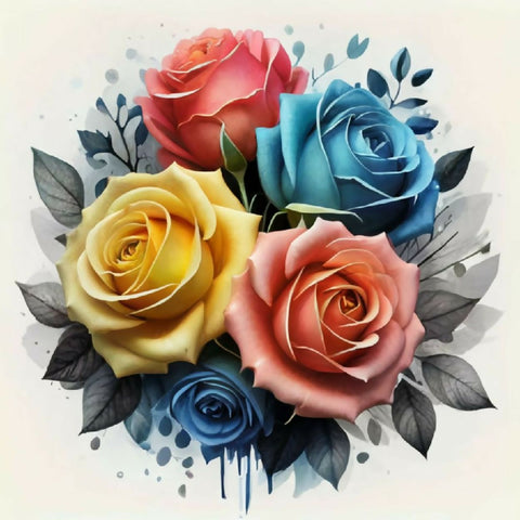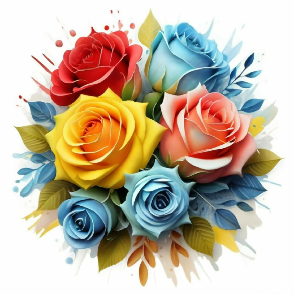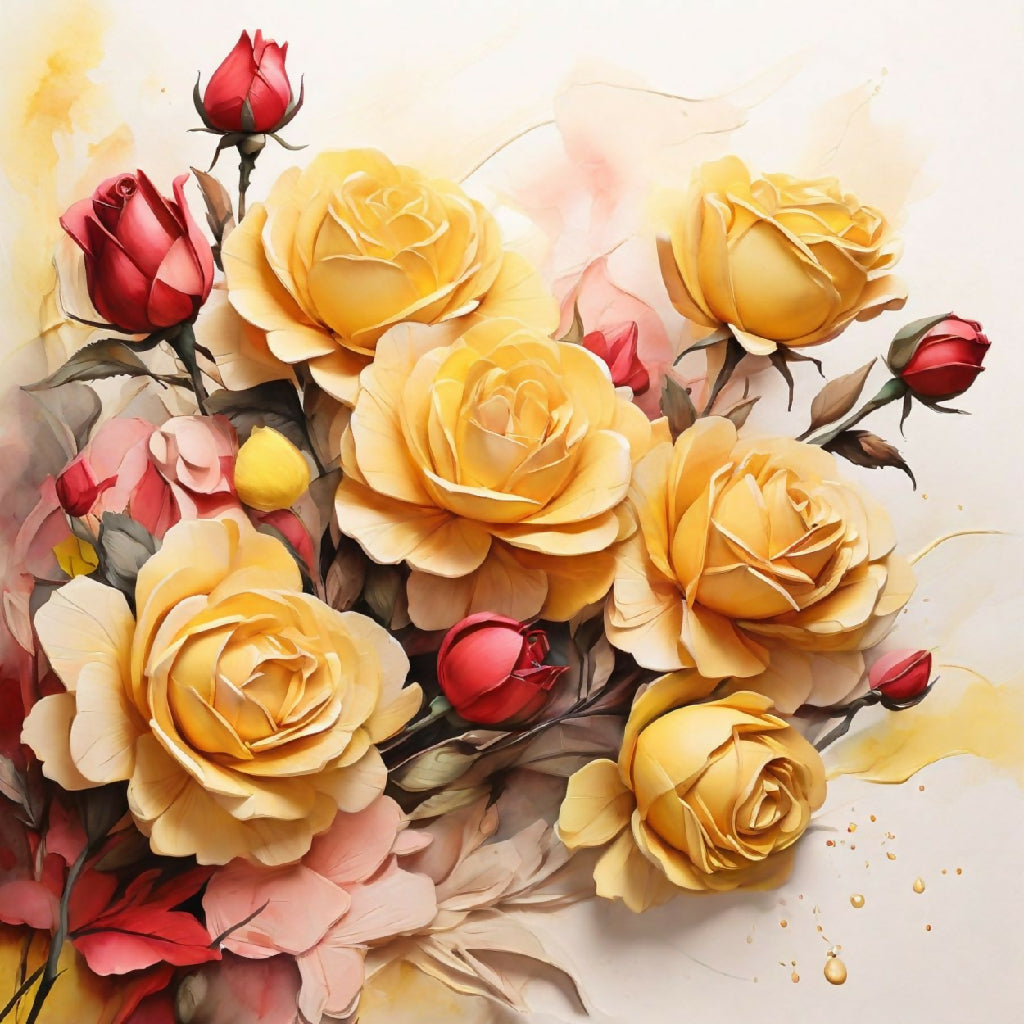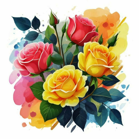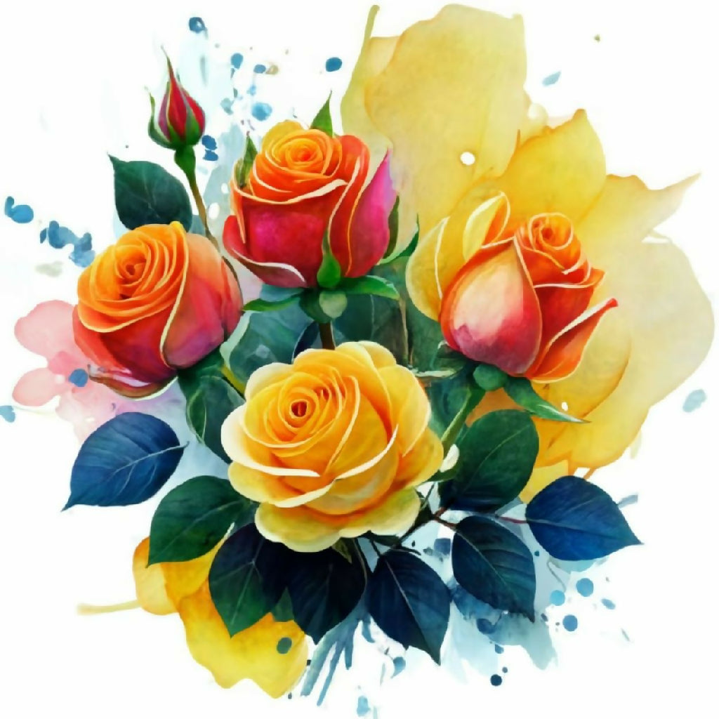 A beautifully painted watercolor floral arrangement featuring a lush bouquet of roses in warm, vibrant hues. The composition includes fully bloomed red, orange, and yellow roses, along with delicate rose buds and small white daisies. Green leaves and stems add natural contrast, while artistic splashes and drips of paint enhance the dynamic, expressive style. The background is softly blended with subtle gradients of yellow, blue, and red, creating a dreamy, romantic atmosphere. This artwork exudes elegance and emotion, perfect for decorative or inspirational purposes.