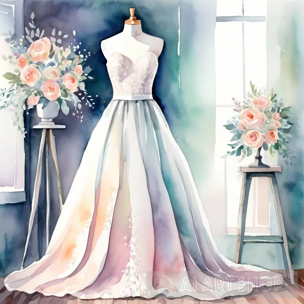 An amazing watercolor of a vintage designer wedding dress in beautiful pastel color