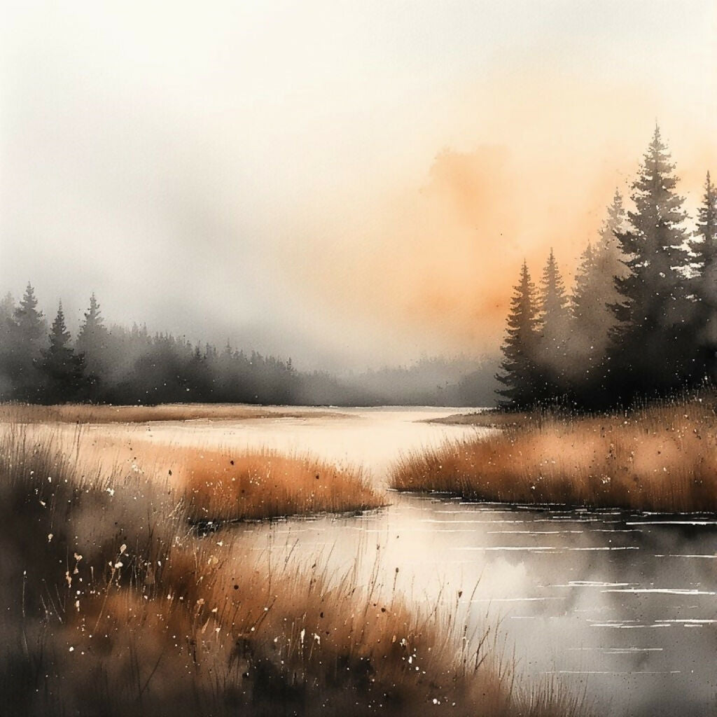 This Ai watercolour artwork captures a peaceful natural landscape. The scene features a quiet river or marsh winding through banks of textured, autumnal grasses.