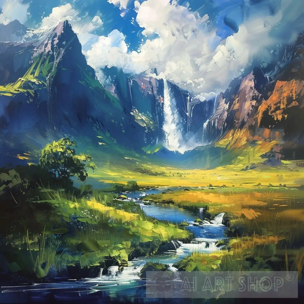 A serene landscape painting with a river and mountain captures the peaceful harmony of nature, showcasing the gentle flow of the river and the majestic presence of the mountain in a tranquil, soothing scene