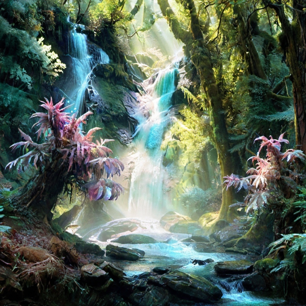 Obra de arte digital creada con inteligencia artificial. Un paisaje fantástico con cascadas brillantes y un bosque mágico iluminado por rayos de luz etéreos. Perfecto para quienes buscan una decoración única, moderna y evocadora. Resolución de alta calidad, ideal para impresiones y coleccionar NFT.