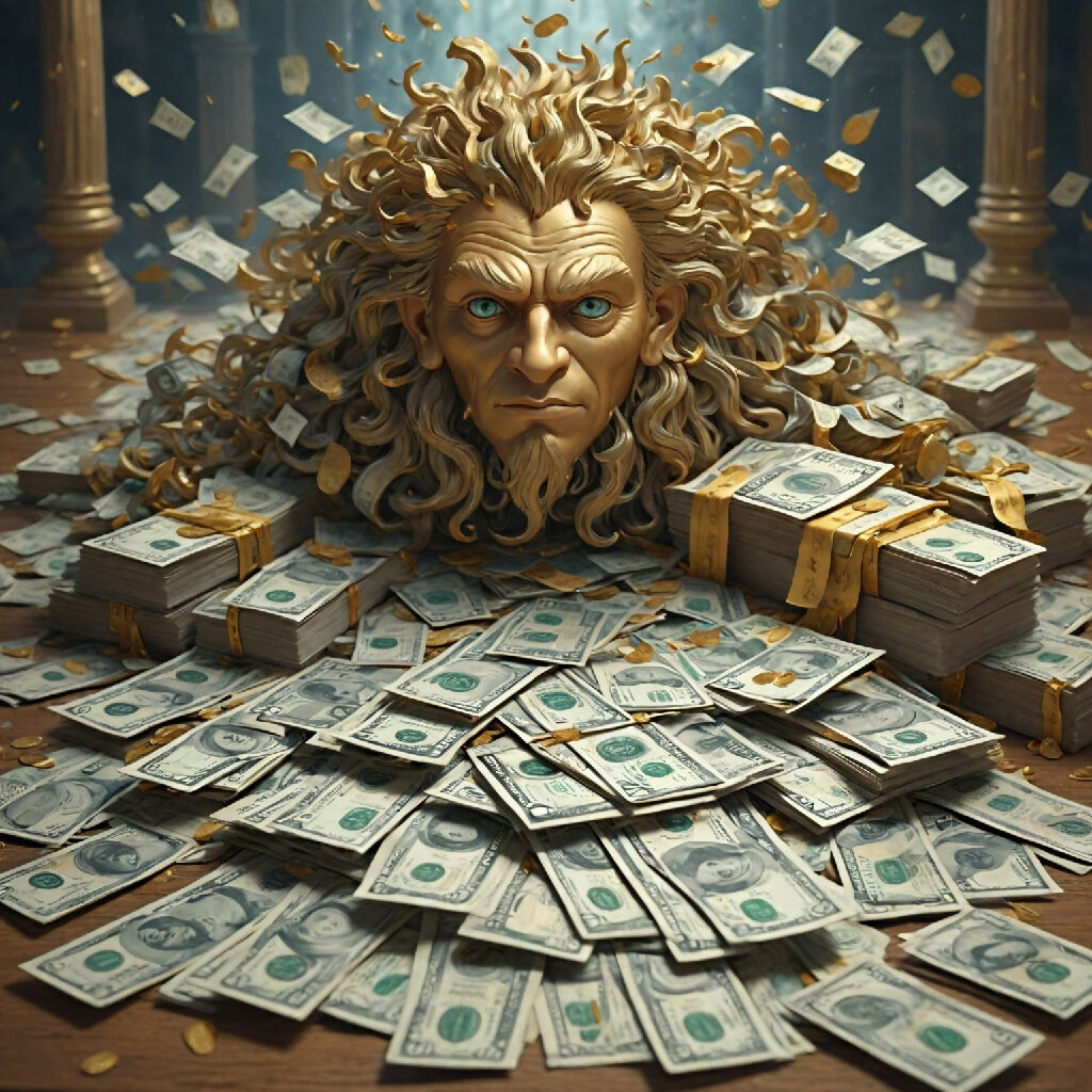 Dive into a world where mythology meets opulence with "Wealth Guardian." This captivating digital artwork features a mythical figure with flowing, golden locks, surrounded by an abundance of money and gold coins. The intense gaze of the guardian conveys both wisdom and the allure of untold riches, making it a perfect centerpiece for those who appreciate art that tells a story of fortune and guardianship.