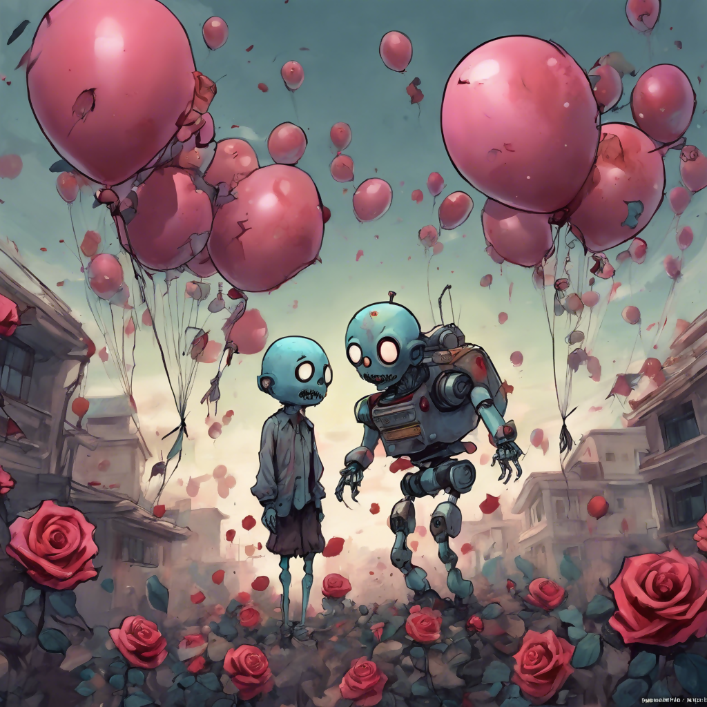 A whimsical scene with robototic zombies, balloons, and roses on a street.