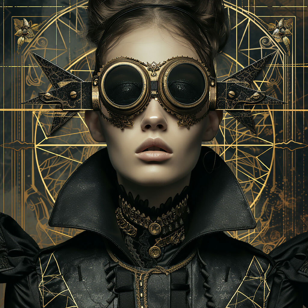 A surreal steampunk futuristic portrait of a woman in front of her home.