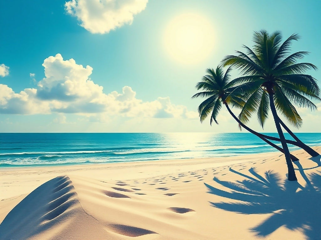 Tall, slender palm trees sway lightly in the warm wind, providing shady spots to relax and enjoy the view. Its green leaves contrast beautifully with the bright sand and deep blue water.