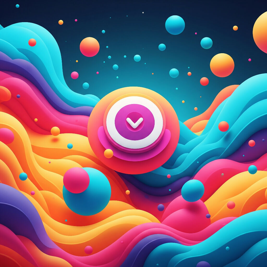 Ein fröhliches und dynamisches AI-Kunstwerk, das geschichtete, wellenförmige Formen und schwebende Kugeln in einer lebendigen Farbpalette darstellt, die ein Gefühl von Freude und Verspieltheit vermitteln.