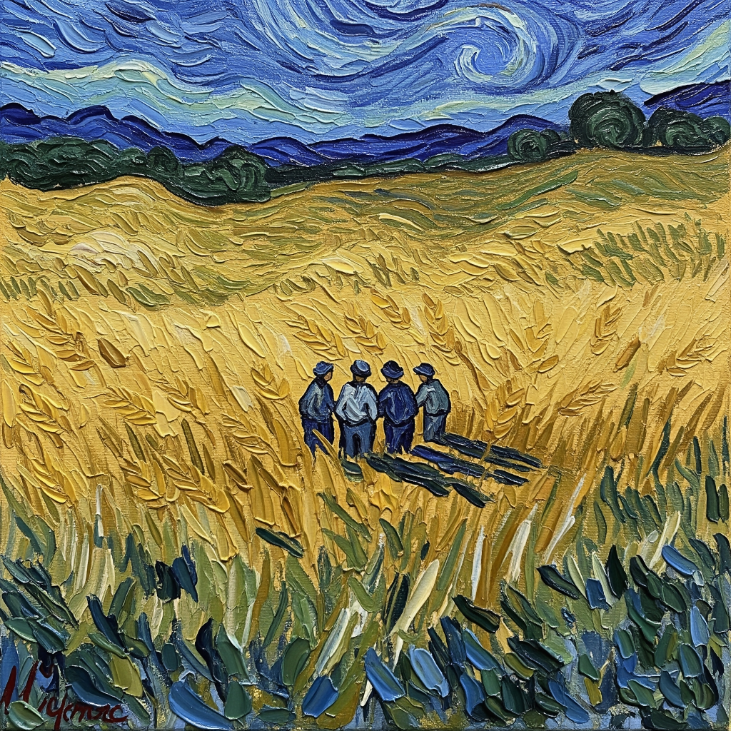 The canvas captures a group of children exploring a vibrant field under a dramatic, swirling sky. The artwork is created in a style inspired by the late impressionist master, Vincent van Gogh, with thick, bold brushwork and a rich, tactile texture that brings the scene to life. The golden wheat and deep blue sky create a striking contrast, inviting the viewer to step into a moment of childhood wonder and natural beauty.