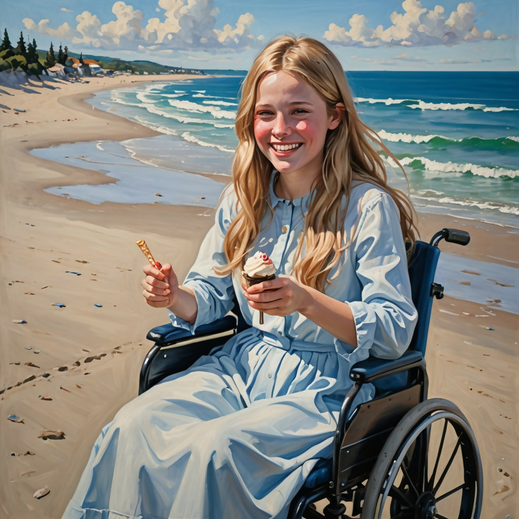 A joyful girl in a wheelchair savors her ice cream, laughter sparkling in her eyes as sunshine warms her smiling face.