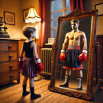 A young boy sees himself grown in the mirror, looking back as a strong boxer.