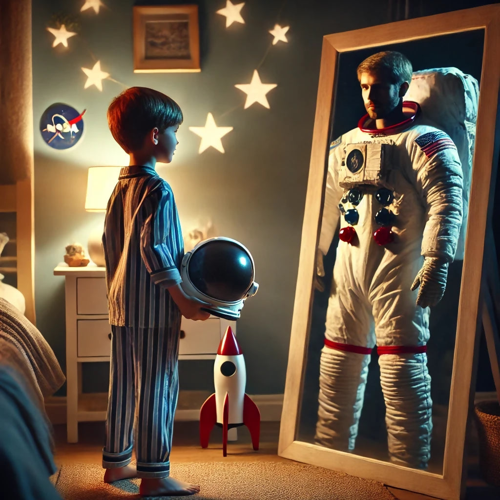 A young boy sees his reflection as an astronaut.
