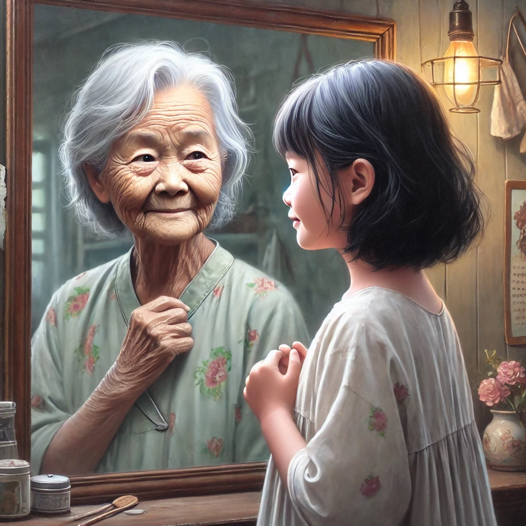 This touching artwork captures a young girl peering into a rustic mirror, where her reflection shows an elderly version of herself with a gentle smile and serene wisdom. Set against a cozy, simple background with floral patterns and soft lighting, this piece highlights themes of growth, life’s journey, and the enduring connection between generations.